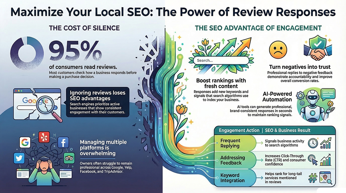 Responding to reviews shows search engines that a business is active, attentive, and committed to customer satisfaction.