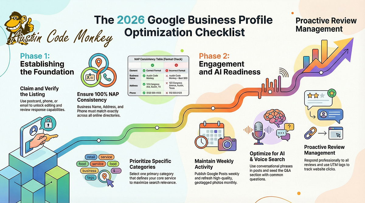 In 2026, your Google Business Profile is your business's front door. This episode explores Austin Code Monkey’s guide to turning it into a customer magnet: NAP consistency, category selection, review engagement, and weekly posts that boost "near me" visibility on Google Maps. Learn why it's a smarter ROI than paid ads. Full strategy at https://austincodemonkey.com/.