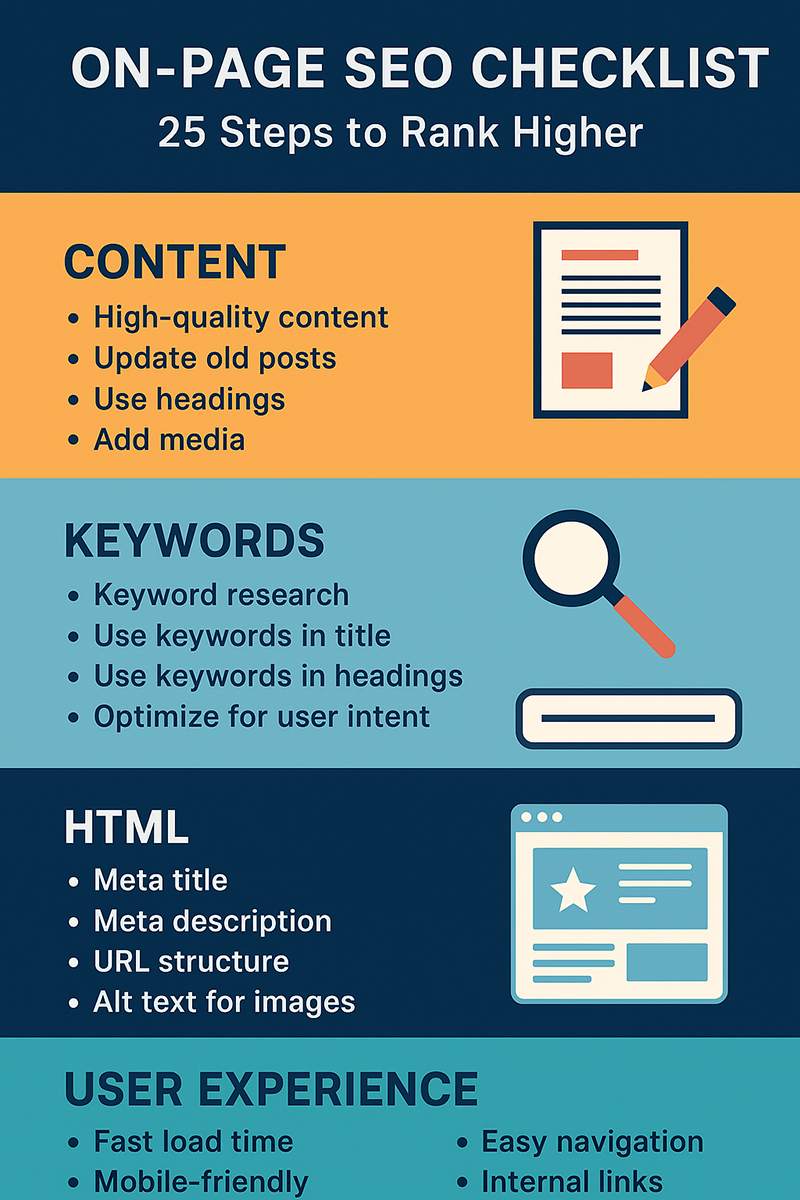 On-page SEO is the foundation of higher rankings. By following this 25-step checklist, youâll improve visibility, user experience, and conversions.
